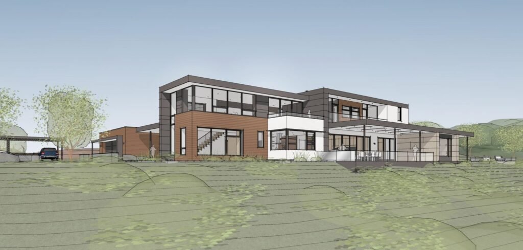 The house sits on one acre at the top of a low hill range overlooking Milpitas. The city was very cognizant of the importance of keeping a low profile at this crestline and required extensive story poles and photo evidence of the proper height and siting so as not to be seen from certain selected vantage points. The house construction has broken ground and is due for completion at the end of Summer 2020.