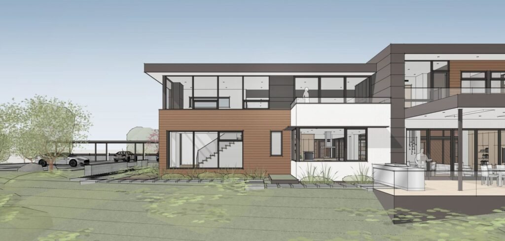 A 6,000 square foot 2-story new home complex in Milpitas was designed to facilitate the owners’ large business parties and gatherings, to have rooms for the kids to come back to upstairs, and a ground floor master suite with a huge walk-in closet. Several separate structures make up the dwelling: The main house, 3-car garage with carport for overflow parking, and a separate entertainment and recreation building separated by a courtyard from the main house.
