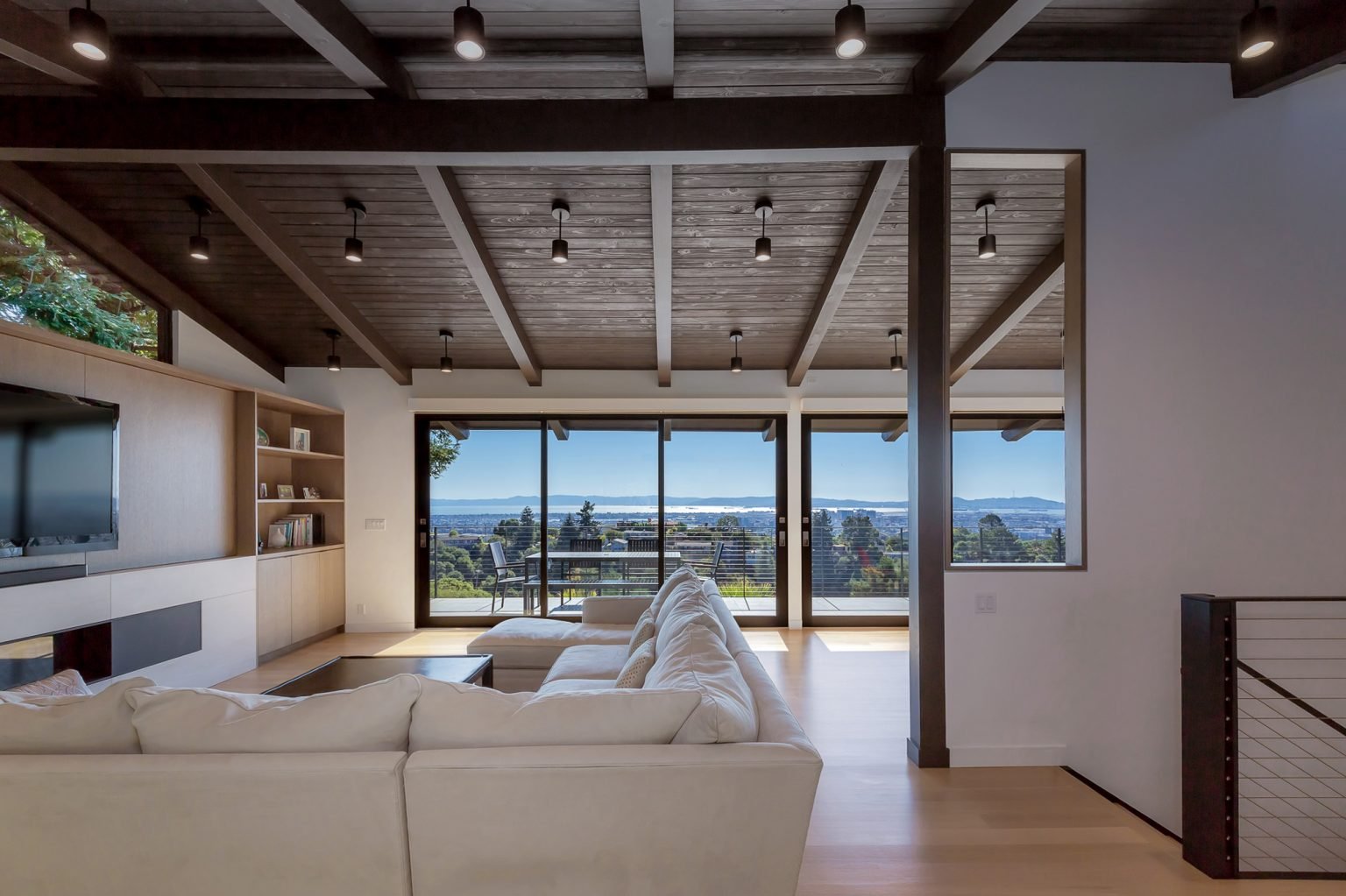 The living room received attention with new high clerestory windows above a built-in fireplace, bookcase and entertainment cabinet in wood matching the kitchen. New Fleetwood sliding doors on either side give a see through experience from the street to the view side of the house. An existing stair opening was kept, but reversing the stair direction with a new open steel and wood staircase improved circulation dramatically.